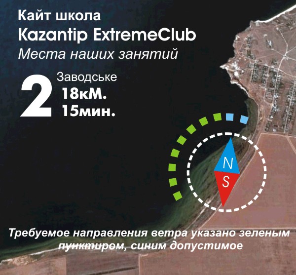 такое место!Оно оказалось совсем рядом! Здесь отличные условия! Нашли и объездили мы его первыми, до нас там кайтсерферов никто не видел! И это всего лишь в 20-ти минутах от "Kazantip ExtremeClub". Место подходит как для учеников, так и для опытных кайтрайдеров. Продвинутые ученики здесь комфортно могут осваивать приемы хождения по волне! Дело в том, что здесь мелководье внезапно переходит в глубину, в этом месте начинаются волны. Ученик, осваивающий хождение по волнам, из глади плавно попадает на волну. Если упал - не страшно, через минуту ты уже на мели и сможешь опять продолжить! Для катания необходимы западные направления ветра. Это место под условным номером 2. Этот спот вы найдете на схеме.